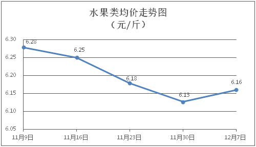 水果类商品价格总体略涨。所监测的水果商品价格波动情况为3涨2跌1平,综合零售均价为每斤6.16元,环比上涨0.54%。其中橙子、葡萄、梨零售均价分别为每斤6.24元、11.64元、5.10元,环比分别下降0.64%、上涨1.84%、上涨0.39%。