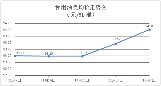 食用油类商品价格稳中微涨。所监测的食用油(5L装)商品价格波动情况为4涨5平,综合零售均价为每桶94.01元,环比上涨0.47%。其中:大豆油、玉米油零售均价分别为每桶60.43元、76.07元,环比分别上涨0.13%、上涨0.28%。