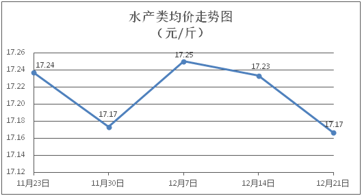 水产类商品价格微幅下降。所监测的水产商品价格波动情况为1涨5跌3平,综合均价为每斤17.17元,环比下降0.39%。其中:草鱼、鲫鱼、鳙鱼、基围虾零售均价分别为每斤11.46元、13.86元、10.61元、28.13元,环比分别持平、下降0.22%、下降1.39%、下降0.42%。