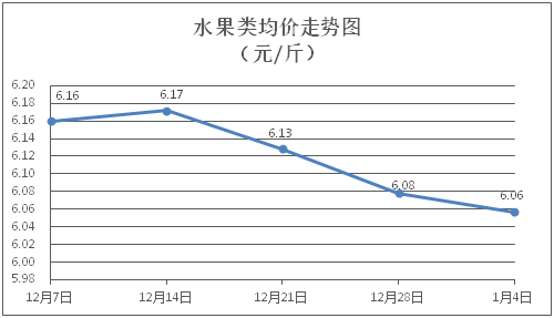 水果类商品价格总体微降。所监测的水果商品价格波动情况为2涨3跌1平,综合零售均价为每斤6.06元,环比下降0.36%。其中橙子、苹果、香蕉零售均价分别为每斤5.83元、7.95元、2.79元,环比分别下降0.51%、下降0.50%、上涨0.72%。