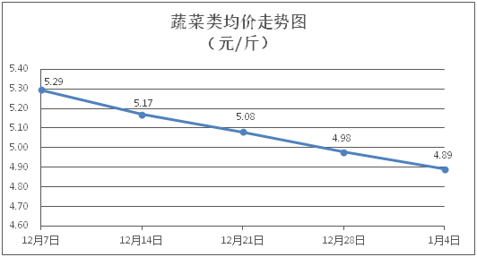 蔬菜类商品价格普遍下降。所监测的蔬菜商品价格波动情况为5涨24跌3平,综合零售均价为每斤4.89元,环比下降1.73%。其中:涨幅居前的品种包括本地菜心、蒜苔、青皮冬瓜,零售均价分别为每斤4.67元、8.89元、2.60元,环比分别上涨2.86%、1.60%、0.39%;跌幅靠前的品种为西红柿、生菜、花菜,零售均价分别为每斤6.72元、3.85元、4.59元,环比分别下降6.28%、5.41%、5.17%。