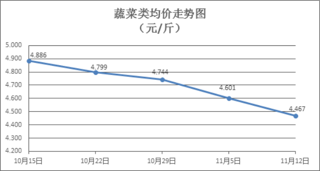 蔬菜类商品价格普遍下调。上周所监测的32 种蔬菜商品价格波动情况为2涨29跌1平,综合零售均价为4.467元/斤,环比下降2.90%。其中:价格上涨的品种包括丝瓜、西红柿,零售均价分别为每斤4.45元、4.16元,环比分别上涨1.60%、0.24%;跌幅居前的品种为西洋菜、生菜、水东芥菜,零售均价为每斤5.23元、3.62元、3.88元,环比分别下降11.36%、7.42%、5.13%。