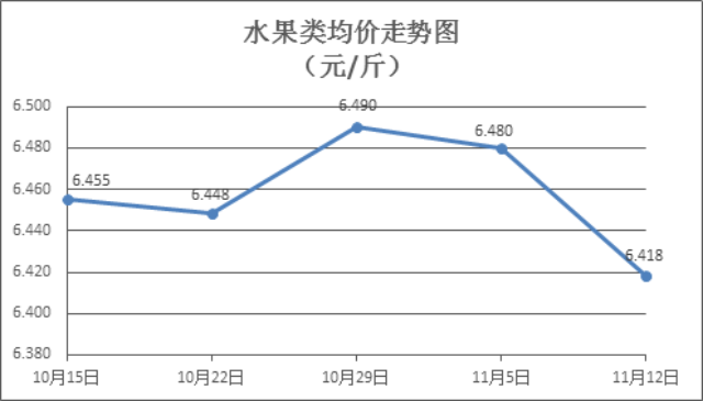 水果类商品价格小幅下浮。上周所监测的6种水果商品价格波动情况为1涨5跌,综合零售均价为6.418元/斤,环比下降0.95%。其中苹果、香蕉、葡萄零售均价分别为每斤7.29元、3.04元、12.83元,环比分别下降0.82%、下降0.33%、下降2.06%。