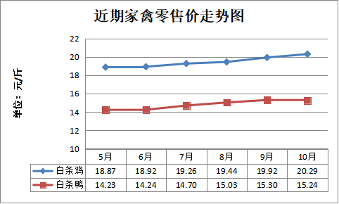 白条鸡、白条鸭零售均价分别为每斤20.29元、15.24元,环比分别上涨1.86%、下降0.39%,同比分别上涨3.68%、上涨7.70%;白壳鸡蛋、鸭蛋零售均价分别为每斤6.80元、7.43元,环比分别上涨1.95%、上涨1.23%,同比分别上涨10.03%、上涨7.84%。