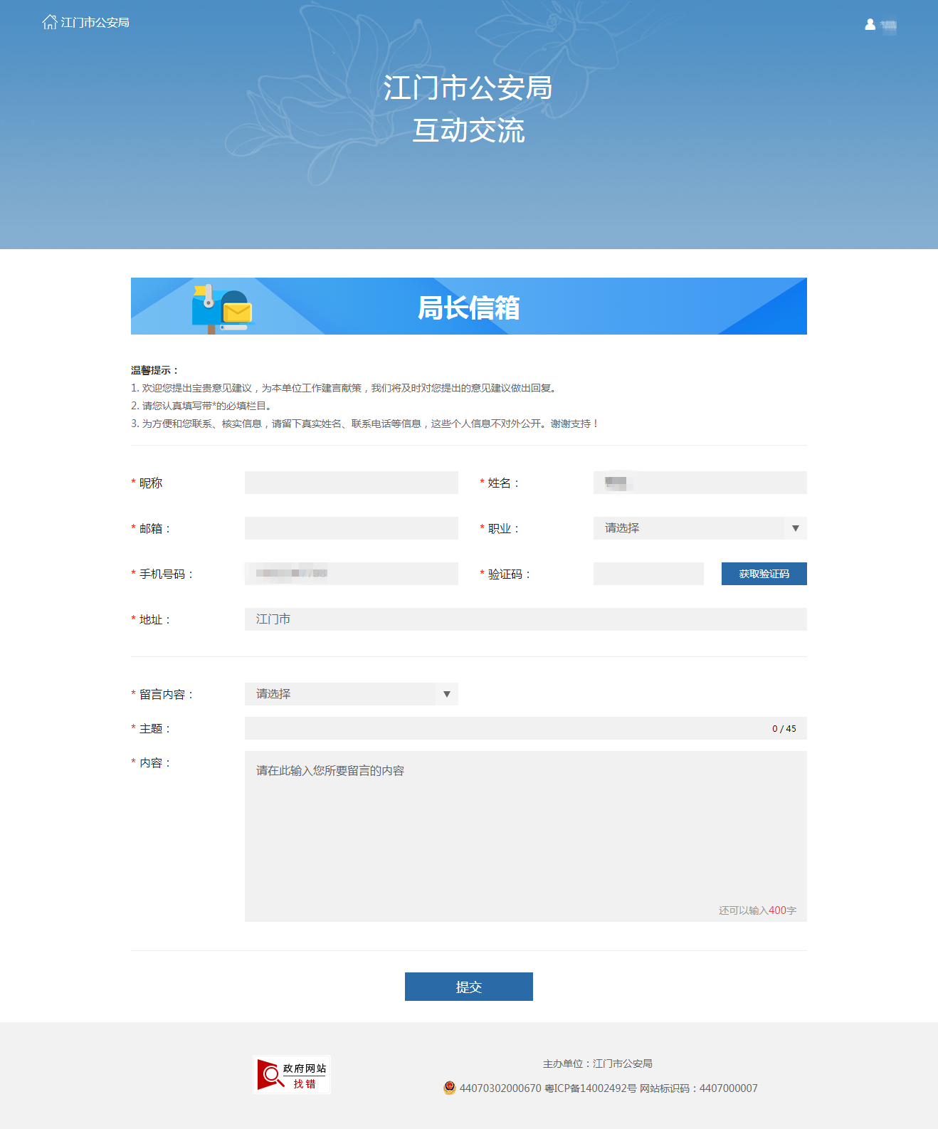第三步:如实填写相关留言信息,并留下您的联系方式(注:本信箱不受理报警及紧急求助。如有需要,请直接拨打110报警电话求助)