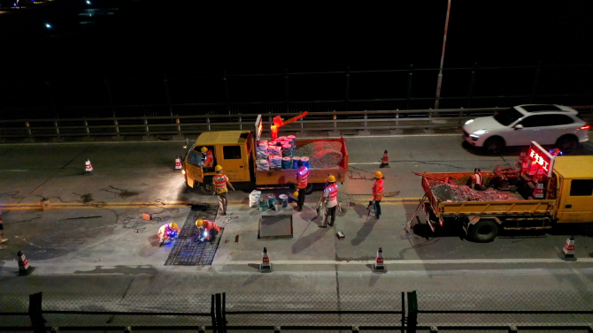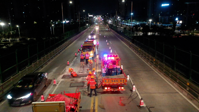 近期,“龙舟水”暴雨频发,为防止雨水渗入梁体侵蚀破坏桥梁,市区公路事务中心采用水泥混凝土路面修补胶(弹性环氧修补胶),拌和出高强度的环氧混凝土对桥面开展修复工作。自5月30日起,组织应急维修队伍在夜间22时至凌晨5时车流量较少时段错峰抢修施工,完成部分破损桥面铺装修复,有效做好安全防范,保障桥梁安全畅通。截至6月6日,该中心累计出动机械车辆30台班、应急维修人员80余人次。