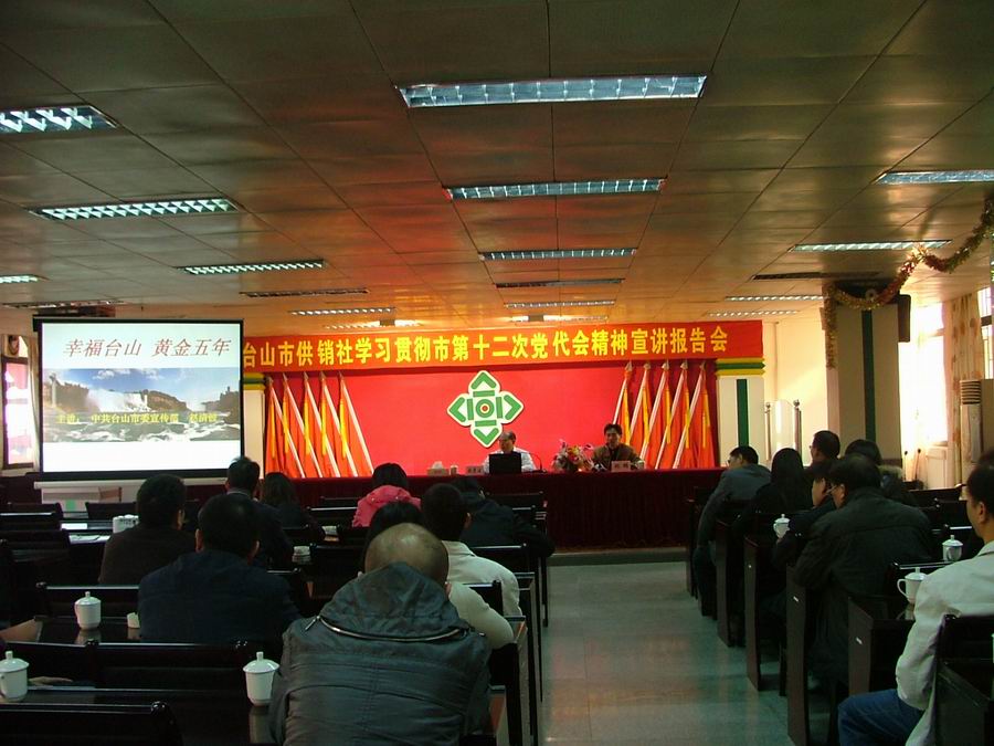 12 月15日 下午,台山市社举行学习贯彻该市第十二次党代会精神宣讲报告会,特别邀请了市委宣传部副部长赵清波同志为市社机关全体干部职工、直属各单位的主要领导等共40余人作了辅导报告。