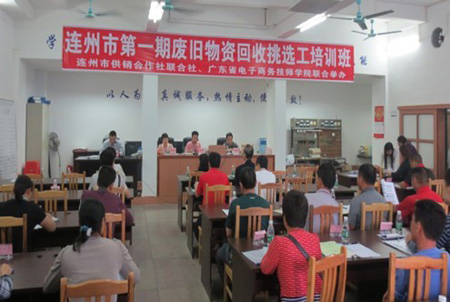 5月中旬,经过大半年的筹备,在广东省电子商务技师学院与连州市供销社的共同努力下,该院与连州市供销社联合举办了第一期废旧物资回收挑选工培训班。