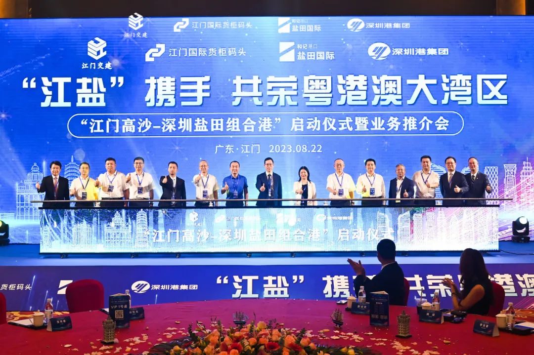 为推进深江两地深度合作,推动珠江口东西两岸融合互动发展,江门市交通建设投资集团有限公司(下称“市交建集团”)与深圳港集团有限公司(下称“深圳港集团”)积极构建起紧密的合作关系。8月22日下午,由江门国际货柜码头有限公司(高沙港)(下称“江门国柜公司”)与盐田国际集装箱码头有限公司(下称“盐田国际”)携手启动“江门高沙—深圳盐田组合港”项目,深江两地相关政府部门负责人,深圳港集团、市交建集团及属下相关企业负责人,200多名港口物流企业家参加了启动仪式。