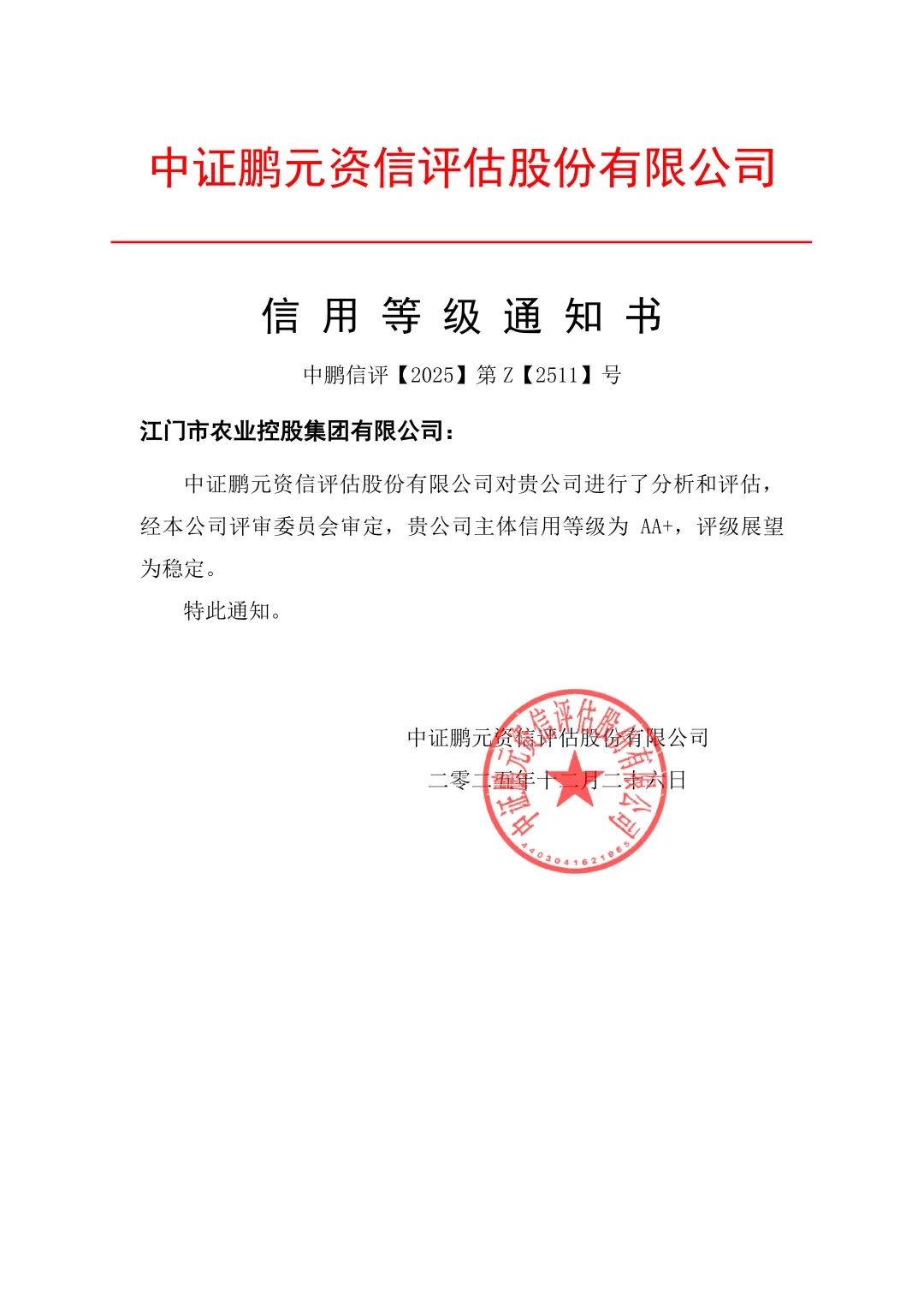 2025年12月26日,经国内权威评级机构——中证鹏元资信评估股份有限公司综合评定,江门市农业控股集团有限公司(以下简称“江门农控集团”)获得主体信用“AA+”评级,评级展望为稳定。中证鹏元作为国内第一梯队评级机构,其评级结果在资本市场具有广泛公信力与影响力。此次荣获“AA+”评级,标志着专业机构对江门农控集团综合实力、资产质量、盈利能力和成长前景的高度认可,是集团深化市场化改革、推动高质量发展取得的关键突破。该评级将有助于集团进一步拓宽融资渠道、降低融资成本,提升在资本市场的信誉与形象。