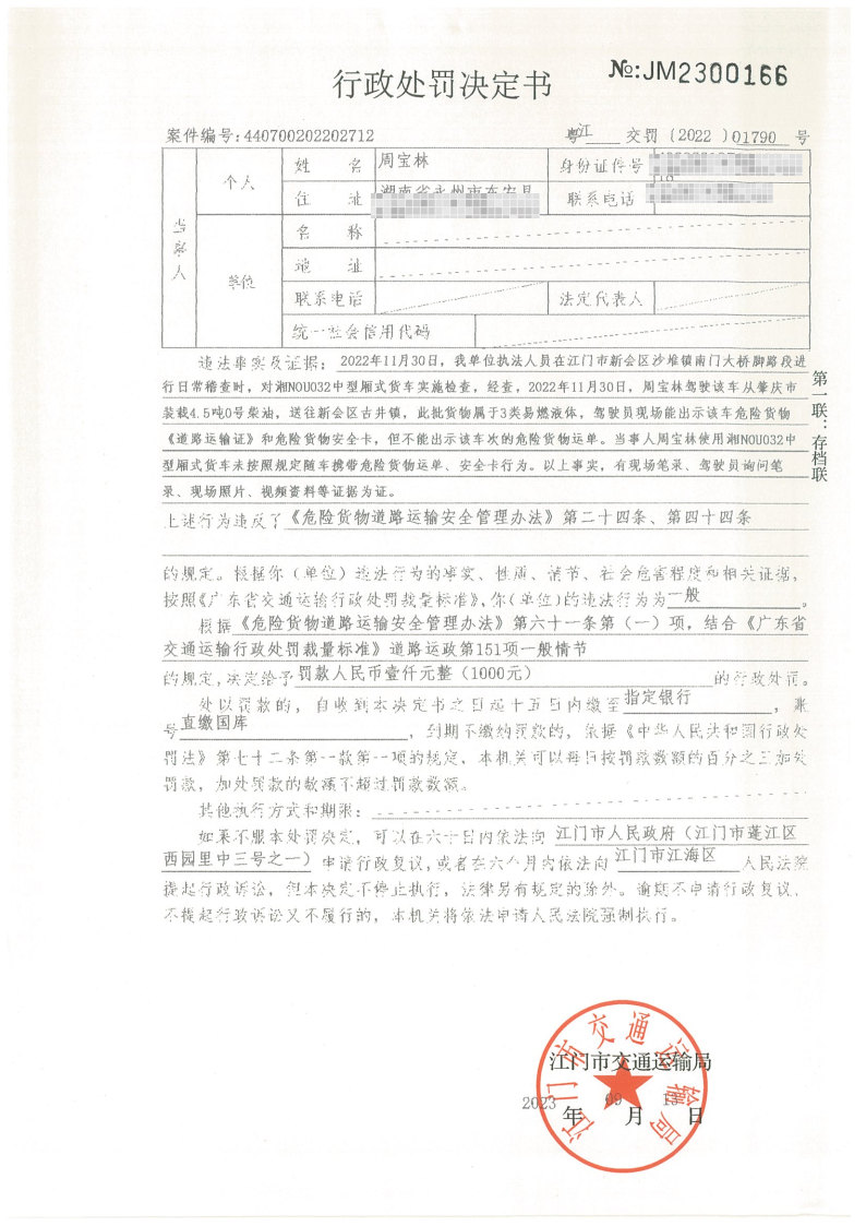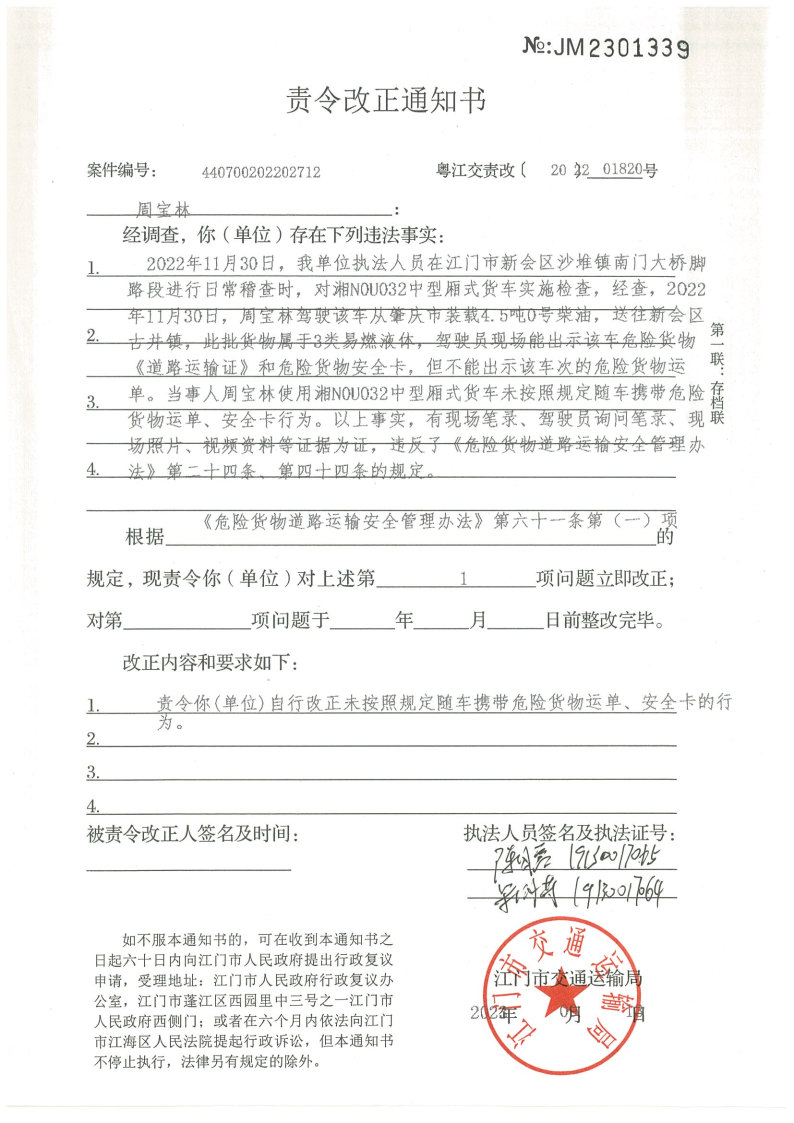 你(单位)因违反交通运输行政管理法规,本机关已作出行政处罚决定和责令改正通知书(具体内容详见附件)。依照《中华人民共和国民事诉讼法》第九十二条的规定,因受送达人采用其他方式无法送达,现向你(单位)公告送达《行政处罚决定书》和《责令改正通知书》。自公告之日起,经过30日即视为送达。