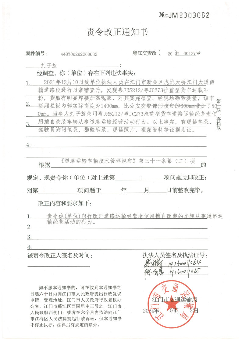 你(单位)因违反交通运输行政管理法规,本机关已作出行政处罚决定和责令改正通知书(具体内容详见附件)。依照《中华人民共和国民事诉讼法》第九十五条的规定,因受送达人采用其他方式无法送达,现向你(单位)公告送达《行政处罚决定书》和《责令改正通知书》。自公告之日起,经过30日即视为送达。