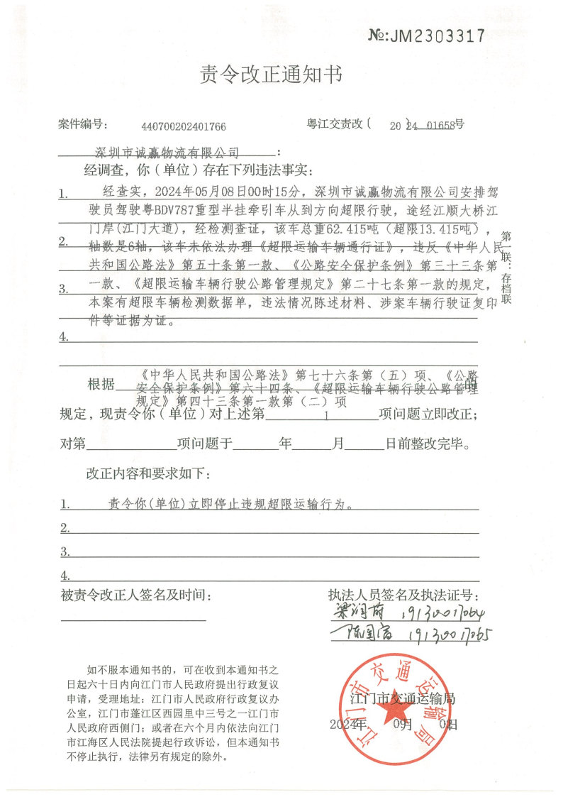 你(单位)因违反交通运输行政管理法规,本机关已作出行政处罚决定和责令改正通知书(具体内容详见附件)。依照《中华人民共和国民事诉讼法》第九十五条的规定,因受送达人采用其他方式无法送达,现向你(单位)公告送达《行政处罚决定书》和《责令改正通知书》。自公告之日起,经过30日即视为送达。