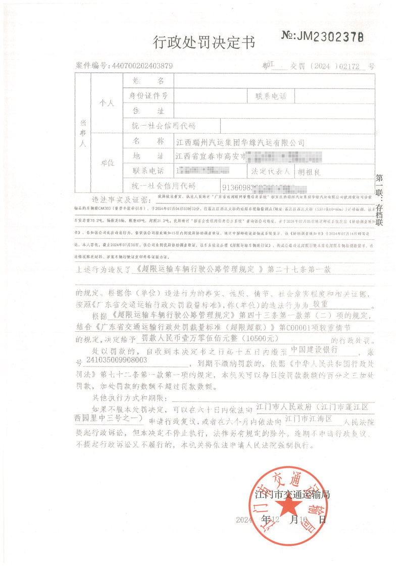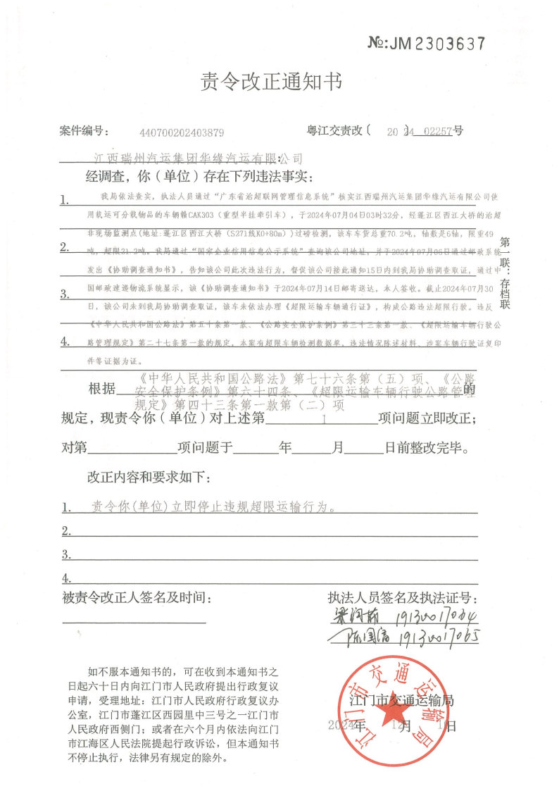 你(单位)因违反交通运输行政管理法规,本机关已作出行政处罚决定和责令改正通知书(具体内容详见附件)。依照《中华人民共和国民事诉讼法》第九十五条的规定,因受送达人采用其他方式无法送达,现向你(单位)公告送达《行政处罚决定书》和《责令改正通知书》。自公告之日起,经过30日即视为送达。