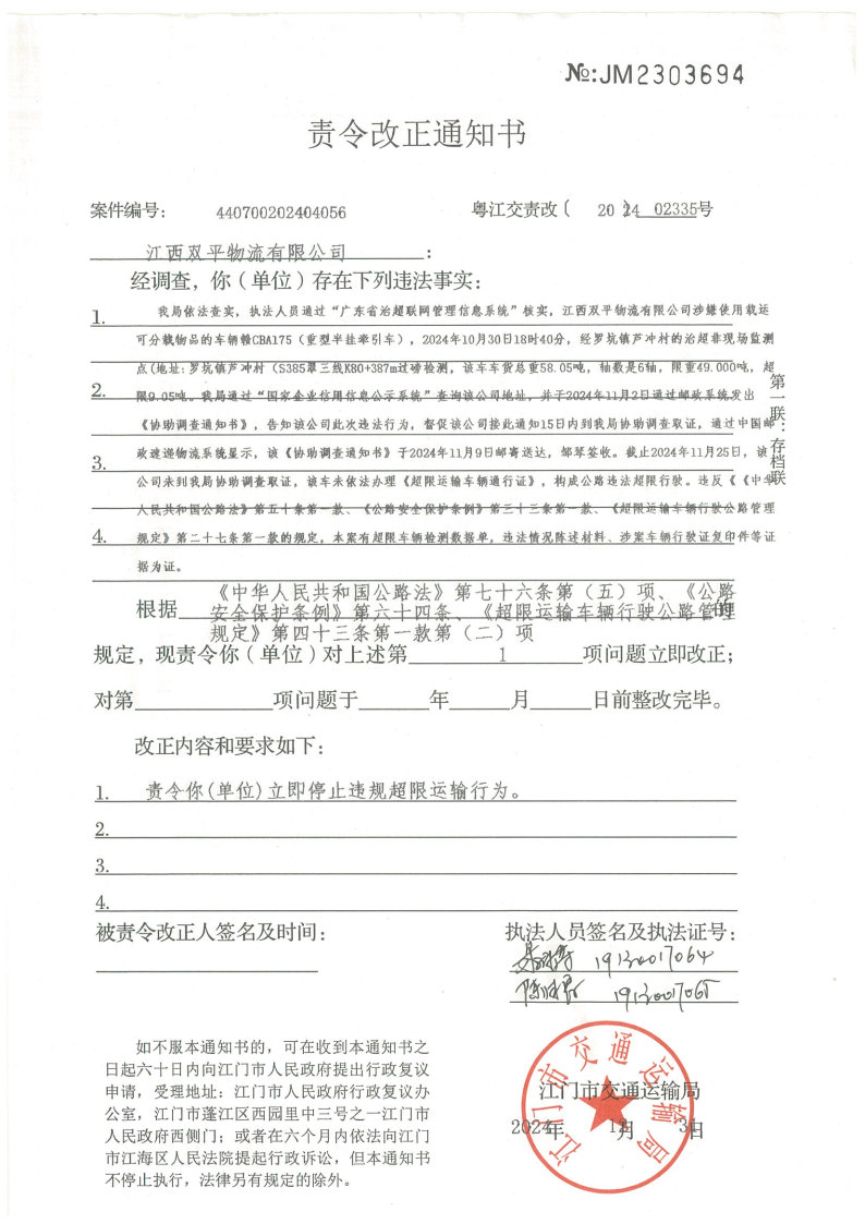 你(单位)因违反交通运输行政管理法规,本机关已作出行政处罚决定和责令改正通知书(具体内容详见附件)。依照《中华人民共和国民事诉讼法》第九十五条的规定,因受送达人采用其他方式无法送达,现向你(单位)公告送达《行政处罚决定书》和《责令改正通知书》。自公告之日起,经过30日即视为送达。