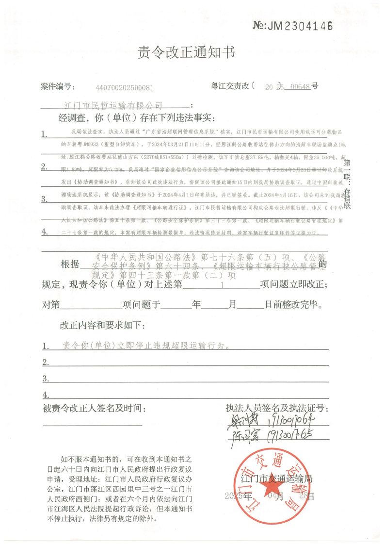 你(单位)因违反交通运输行政管理法规,本机关已作出行政处罚决定和责令改正通知书(具体内容详见附件)。依照《中华人民共和国民事诉讼法》第九十五条的规定,因受送达人采用其他方式无法送达,现向你(单位)公告送达《行政处罚决定书》和《责令改正通知书》。自公告之日起,经过30日即视为送达。