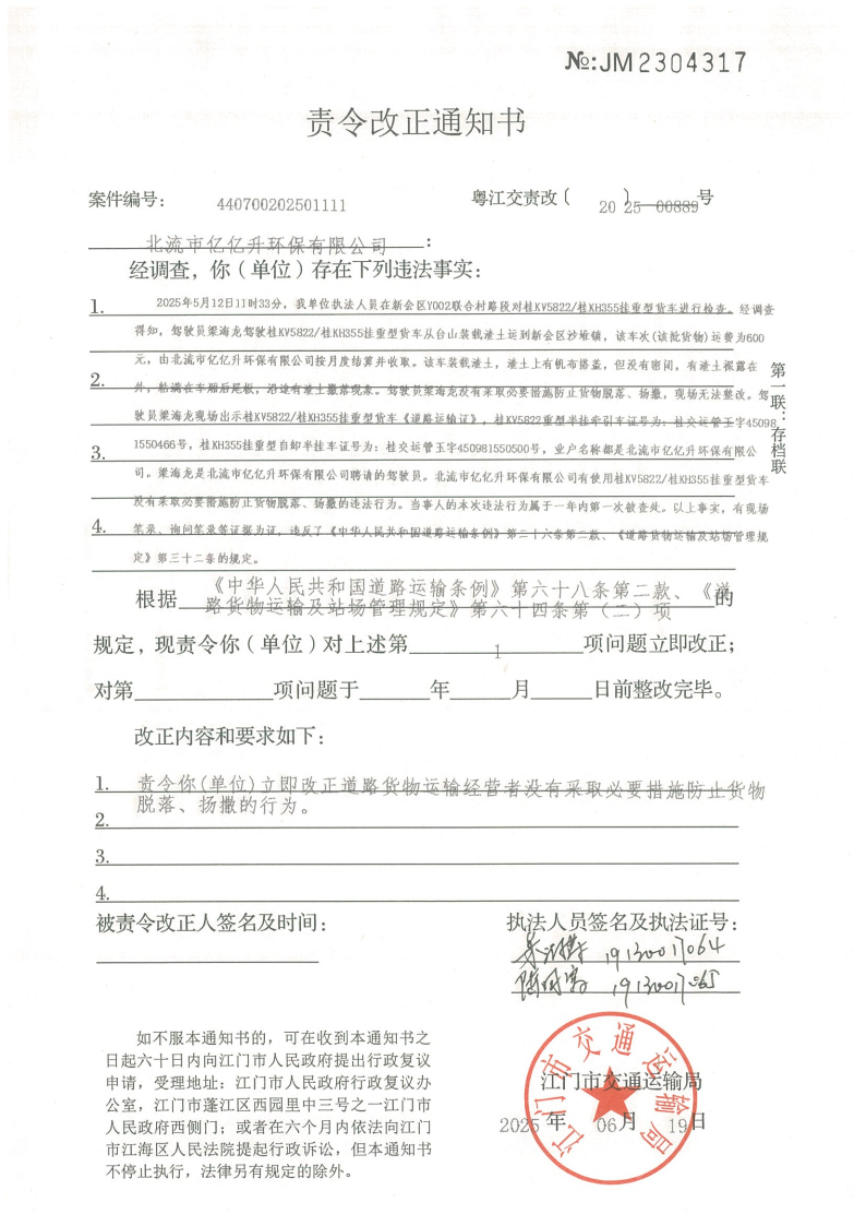 你(单位)因违反交通运输行政管理法规,本机关已作出行政处罚决定和责令改正通知书(具体内容详见附件)。依照《中华人民共和国民事诉讼法》第九十五条的规定,因受送达人采用其他方式无法送达,现向你(单位)公告送达《行政处罚决定书》和《责令改正通知书》。自公告之日起,经过30日即视为送达。