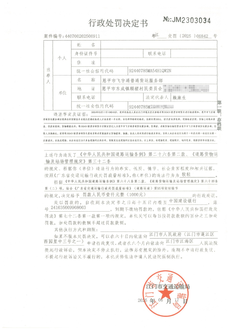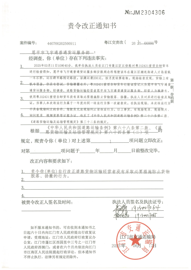 你(单位)因违反交通运输行政管理法规,本机关已作出行政处罚决定和责令改正通知书(具体内容详见附件)。依照《中华人民共和国民事诉讼法》第九十五条的规定,因受送达人采用其他方式无法送达,现向你(单位)公告送达《行政处罚决定书》和《责令改正通知书》。自公告之日起,经过30日即视为送达。