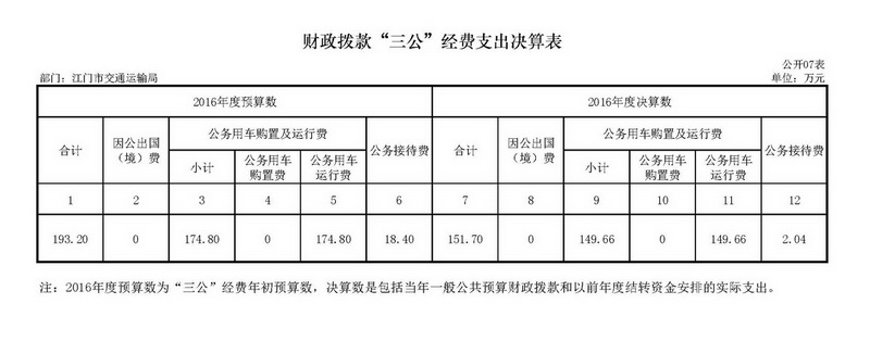 江门市交通运输局2016年度“三公”经费财政拨款支出决算为151.70万元,完成预算193.20万元的78.52 %。其中:因公出国(境)费支出决算为0元,预算为0元;公务用车购置及运行维护费支出决算为149.66元,完成预算174.80万元的85.62 %;公务接待费支出决算为2.04万元,完成预算18.40万元的15.81 %。2016年度“三公”经费支出决算小于预算数的主要原因:我局认真贯彻落实中央八项规定精神和厉行节约的要求,并贯彻中央和省的公务用车制度改革精神深化公务用车改革,通过严控“三公”经费开支,全年实际支出比预算有所节约。