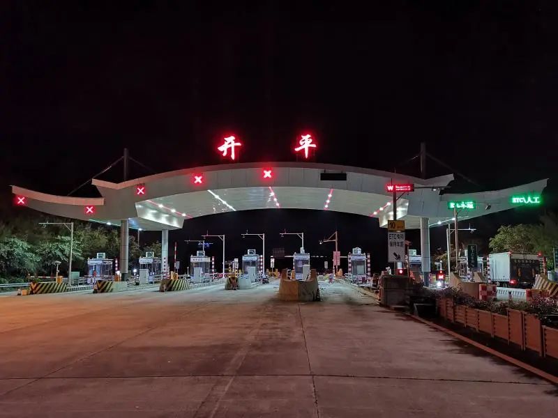 当夜幕降临,一辆辆车辆行驶在开阳高速上,远远就能看到“水口”“开平”“恩城”等红色的发光大字站名,进入收费广场后,收费天棚吊顶内红绿交替变化的灯带显示车道情况,引导车辆通行。