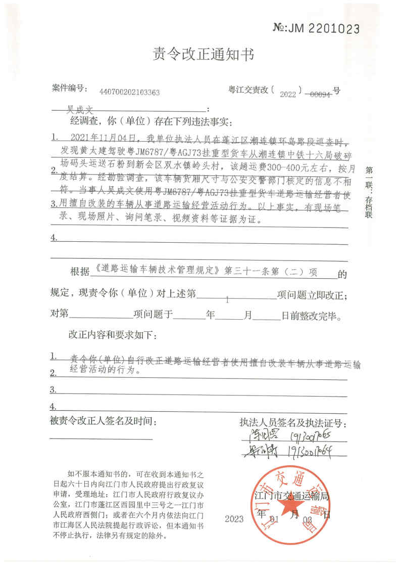 你(单位)因违反交通运输行政管理法规,本机关已作出行政处罚决定和责令改正通知书(具体内容详见附件)。依照《中华人民共和国民事诉讼法》第九十二条的规定,因受送达人采用其他方式无法送达,现向你(单位)公告送达《行政处罚决定书》和《责令改正通知书》。自公告之日起,经过30日即视为送达。
