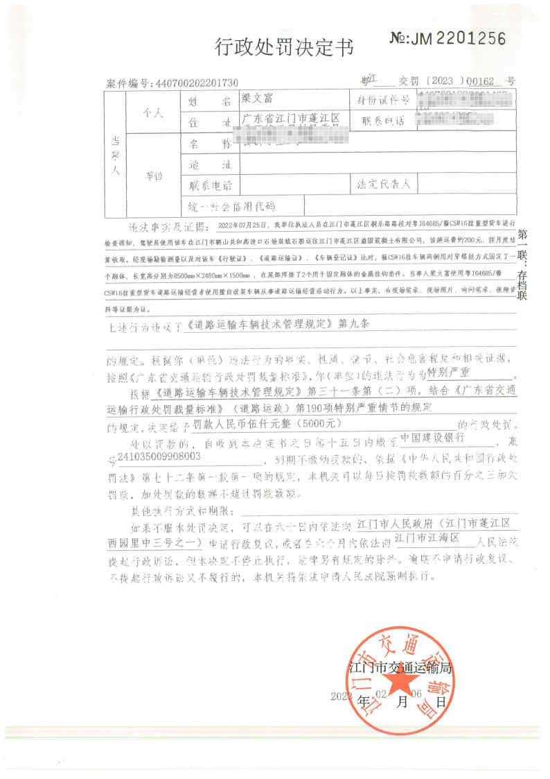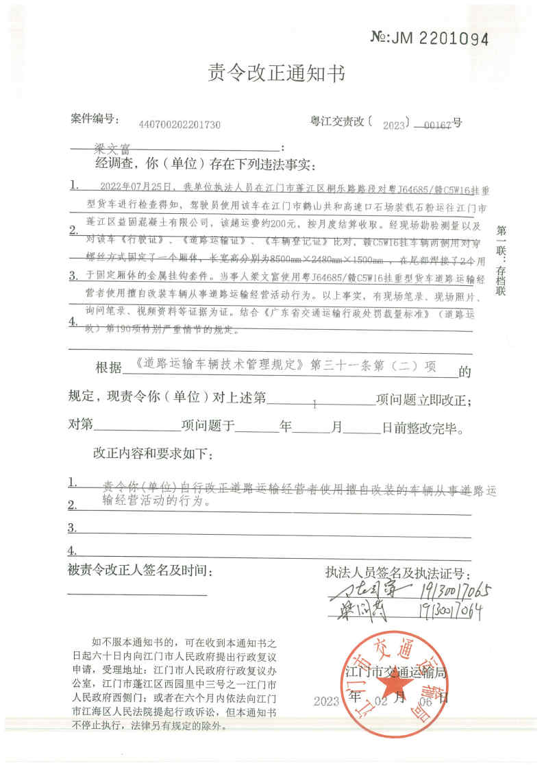 你因违反交通运输行政管理法规,本机关已作出行政处罚决定和责令改正通知书(具体内容详见附件)。依照《中华人民共和国民事诉讼法》第九十二条的规定,因受送达人采用其他方式无法送达,现向你(单位)公告送达《行政处罚决定书》和《责令改正通知书》。自公告之日起,经过30日即视为送达。