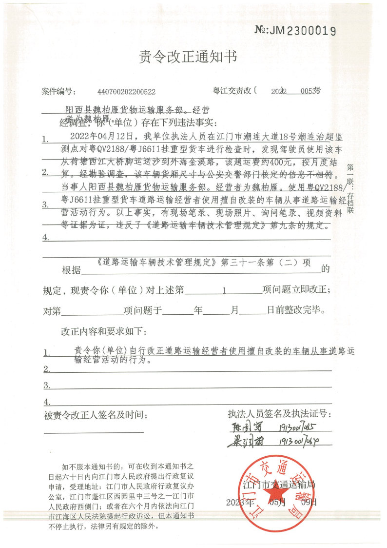 你(单位)因违反交通运输行政管理法规,本机关已作出行政处罚决定和责令改正通知书(具体内容详见附件)。依照《中华人民共和国民事诉讼法》第九十二条的规定,因受送达人采用其他方式无法送达,现向你(单位)公告送达《行政处罚决定书》和《责令改正通知书》。自公告之日起,经过30日即视为送达。