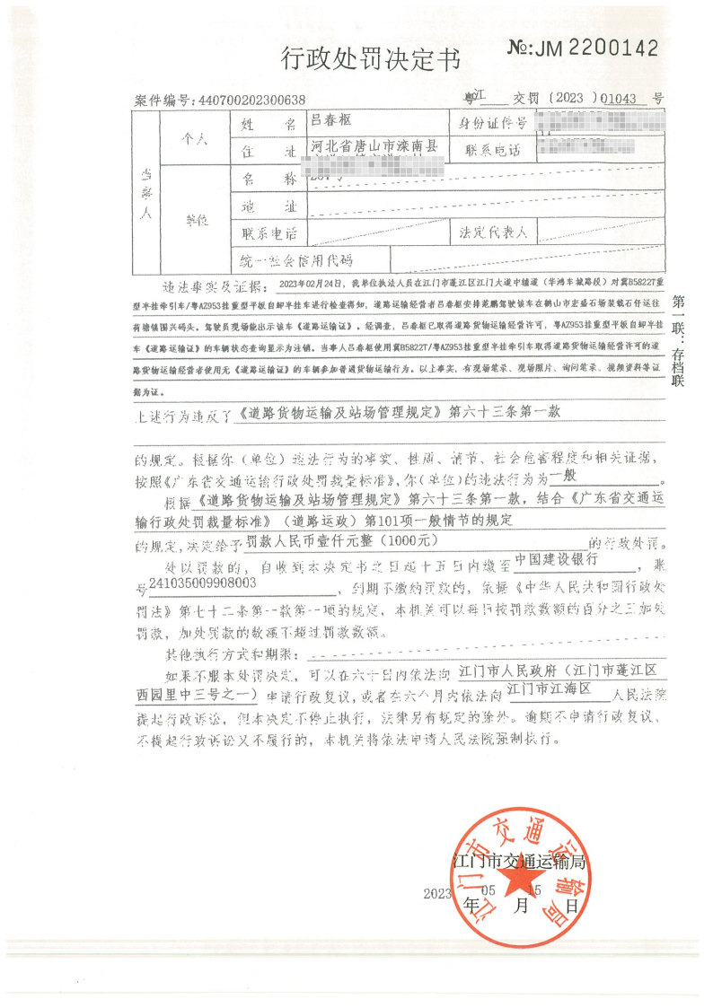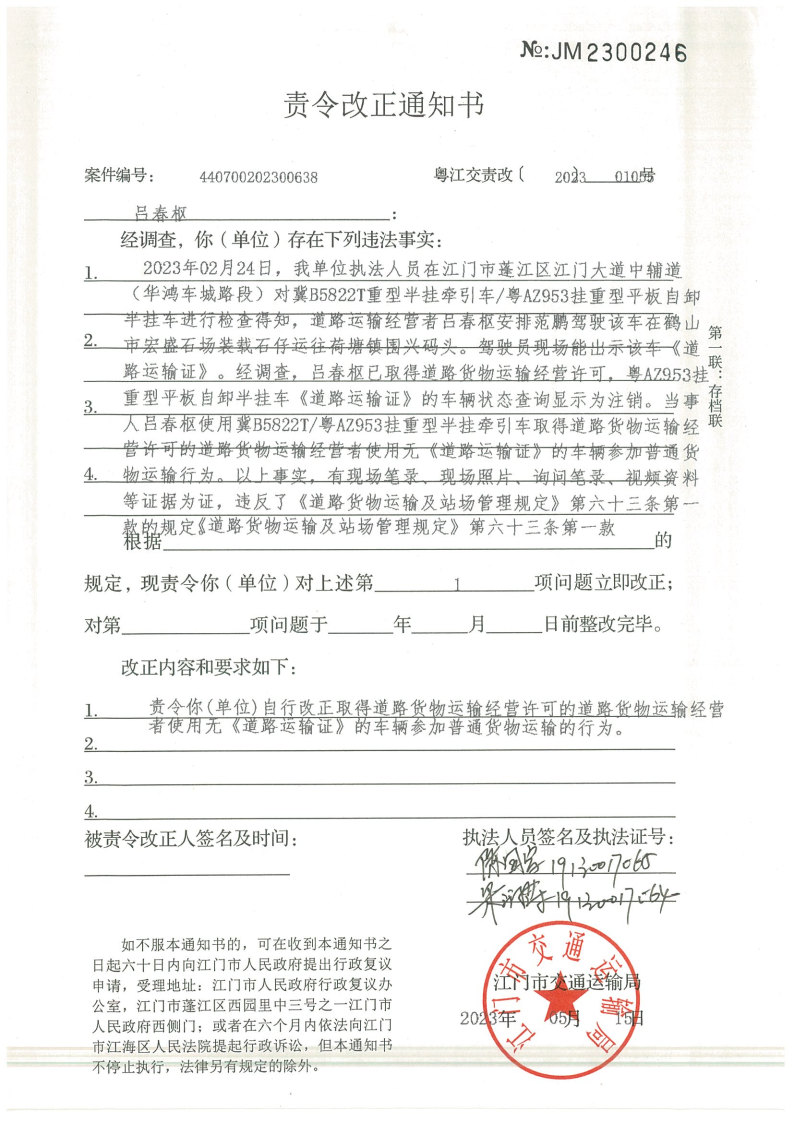 你(单位)因违反交通运输行政管理法规,本机关已作出行政处罚决定和责令改正通知书(具体内容详见附件)。依照《中华人民共和国民事诉讼法》第九十二条的规定,因受送达人采用其他方式无法送达,现向你(单位)公告送达《行政处罚决定书》和《责令改正通知书》。自公告之日起,经过30日即视为送达。