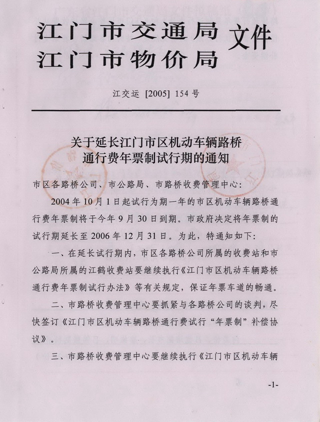 关于延长江门市区机动车车辆路桥通行费年票制试行期的通知 【已废止】
