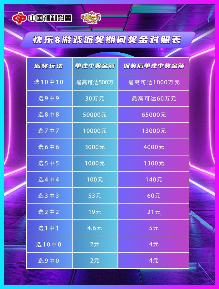 快乐8游戏自上市以来深受广大购彩者的喜爱,累计销量已达70亿元,筹集彩票公益金20多亿元。本次快乐8派奖,所有玩法都参与,最高奖金翻一番,让我们一起期待快乐8大派奖带来的惊喜吧!