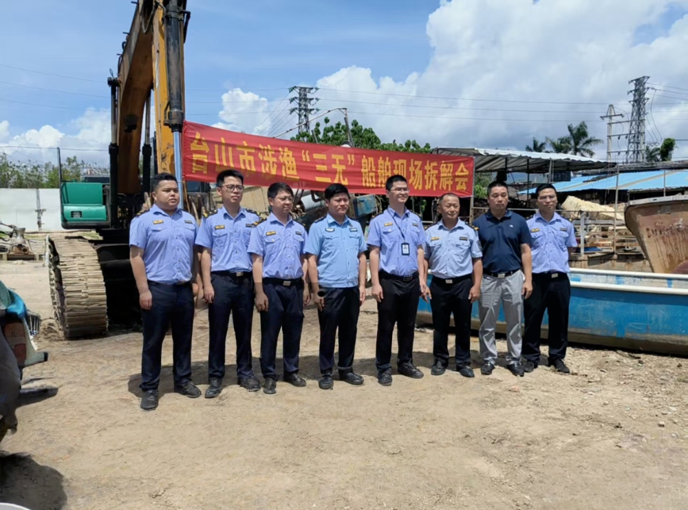 5月22日,市海洋综合执法支队副支队长钟树年到台山市参加涉渔“三无”船舶拆解现场会,本次活动共拆解销毁涉渔“三无”船舶21艘。