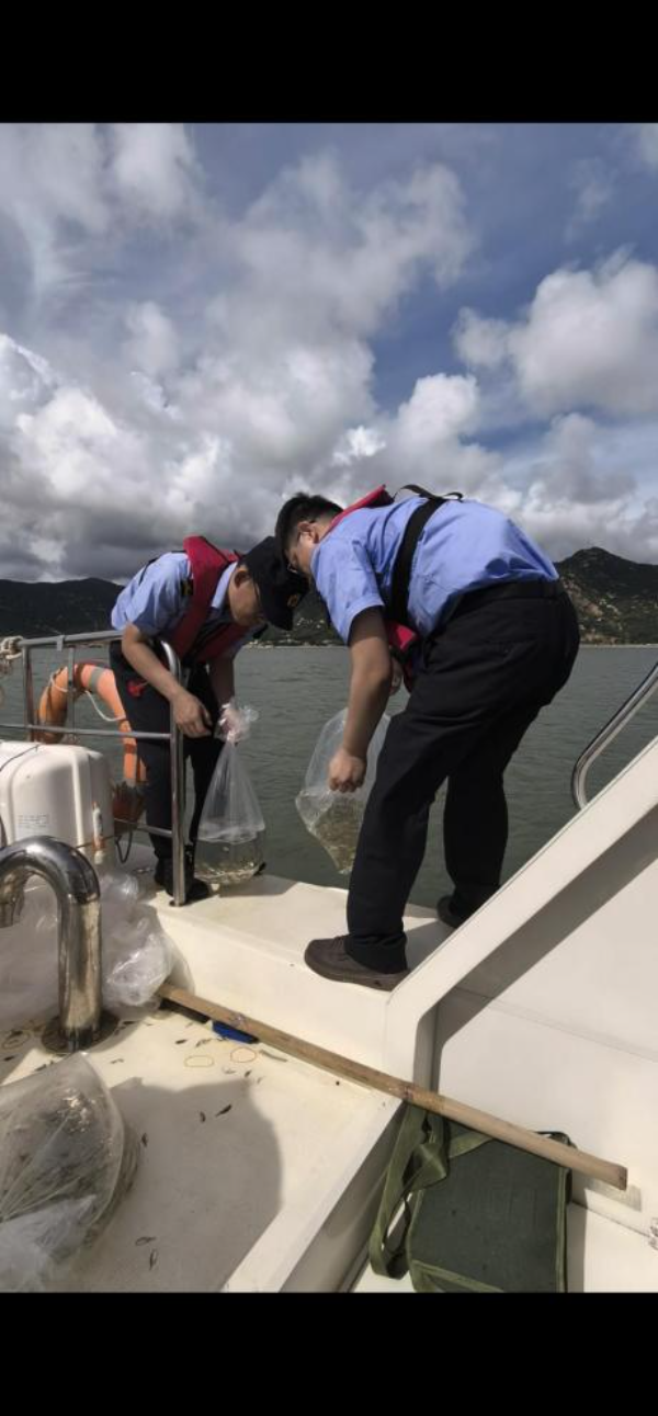 2025年6月19日,江门市海洋综合执法支队(下称江门支队)针对一起非法电鱼捕捞案件,与涉案人员蒙某在台山市广海湾鱼塘港通过增殖放流的方式开展生态损害修复活动,现场共向黄茅海海域放生黑鲷、三线等鱼苗约6万尾,价值约11.8万元。