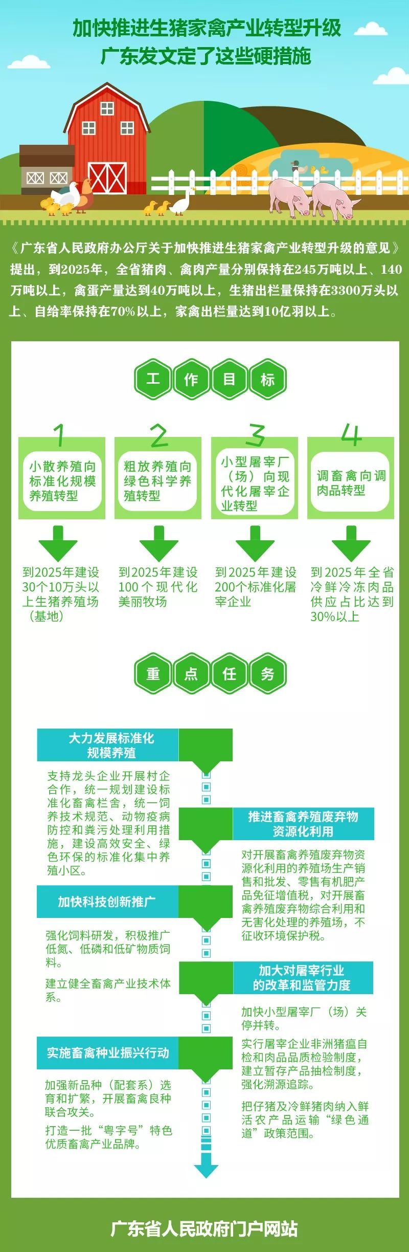 长图内容简洁、明了, 继续向下看,了解深入分析~ 2025年规模企业屠宰量占比超90% 《意见》提出,到2025年, 全省猪肉、禽肉产量分别保持在245万吨以上、140万吨以上,禽蛋产量达到40万吨以上,生猪出栏量保持在3300万头以上、自给率保持在70%以上,家禽出栏量达到10亿羽以上; 建设一批全产业链现代化企业,打造转型升级示范区,构建种业、养殖、屠宰加工、冷链物流配套发展的现代化生猪、家禽产业体系。 “四个转型”之一即小散养殖向标准化规模养殖转型,根据《意见》,到2025年,广东要建设30个10万头以上生猪养殖场(基地),300个万头以上生猪养殖场(基地),1000个畜禽标准化养殖场(小区),规模养殖比例达到80%以上。 对于粗放养殖向绿色科学养殖转型,《意见》明确,到2025年,建设100个现代化美丽牧场,规模养殖场粪污综合利用率达到85%以上,粪污处理设施装备配套基本全覆盖。 “四个转型”的第三个转型就是小型屠宰厂(场)向现代化屠宰企业转型,《意见》提出,到2025年,建设200个标准化屠宰企业,全省屠宰厂(场)数量压减50%以上,规模企业屠宰量占比达90%以上。 调畜禽向调肉品转型是家禽产业转型升级的一个重要标志,《意见》要求,到2025年,建设30个养殖、屠宰、加工、配送全产业链示范企业,全省冷鲜冷冻肉品供应占比达到30%以上。 禁养区划定后5年内不得随意调整 《意见》还从保障畜禽业用地需求方面提出要科学规划养殖用地,保障产业发展空间,如鼓励利用低丘缓坡、荒山荒坡、灌草丛地等建设标准化规模养殖场。允许在Ⅱ、Ⅲ、Ⅳ级保护林地建设规模养殖设施,优先保障安排林地指标,对申请使用林地材料齐全的即到即办等。 同时,《意见》明确严格依法依规划定禁养区,除饮用水水源保护区、风景名胜区、自然保护区、城镇居民区、文化教育科学研究区等人口集中区域以及法律法规规定的其他禁止养殖区域之外,不得超范围划定禁养区。禁养区划定后5年内不得随意调整。各地要制定禁养区矢量化边界图,形成禁养区范围“一张图”。 对于提升产业综合素质,促进绿色发展,《意见》指出,对开展畜禽养殖废弃物资源化利用的养殖场生产销售和批发、零售有机肥产品免征增值税,对开展畜禽养殖废弃物综合利用和无害化处理的养殖场,不征收环境保护税。 将产业转型升级纳入省推进乡村振兴战略实绩考核 《意见》还明确要严格责任制考核,将生猪、家禽产业转型升级纳入省推进乡村振兴战略实绩考核,将最低生猪出栏量纳入“菜篮子”市长负责制考核,各地级以上市生猪出栏量不得低于《广东省生猪生产发展总体规划和区域布局(2018—2020年)》规定的目标任务,2021年起不得低于2020年的目标任务。 对于加强财政和金融支持,《意见》提出积极利用省农业供给侧结构性改革基金,引导金融资本和社会投资主体投资生猪、家禽产业。拓展政策性畜禽生产保险险种。探索开展土地经营权、养殖圈舍、大型养殖机械抵押贷款试点,支持畜禽保单订单和应收账款抵押,解决畜禽业发展融资难题。 《意见》还在建立生猪养殖生态补偿机制方面提出了明确要求,建立生猪销区补偿产区的长效机制,鼓励生猪调入市根据调入量按一定标准向生猪调出市支付补偿资金,补偿生猪产区在发展生猪生产中的疫病防控、污染治理、质量安全监管和生产补贴等投入,平衡产销区利益,提高产区积极性。
