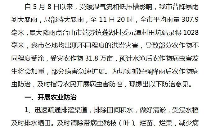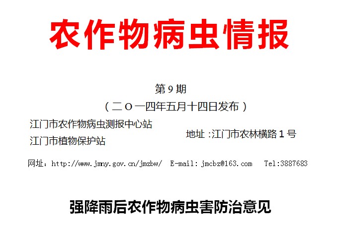 2014年农作物病虫情报第九期(强降雨后农作物病虫害防治意见)