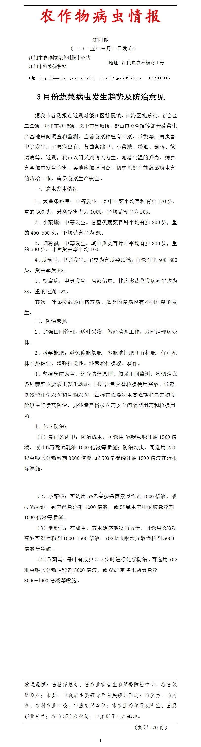 2015年农作物病虫情报第四期(3月份蔬菜病虫发生趋势及防治意见)