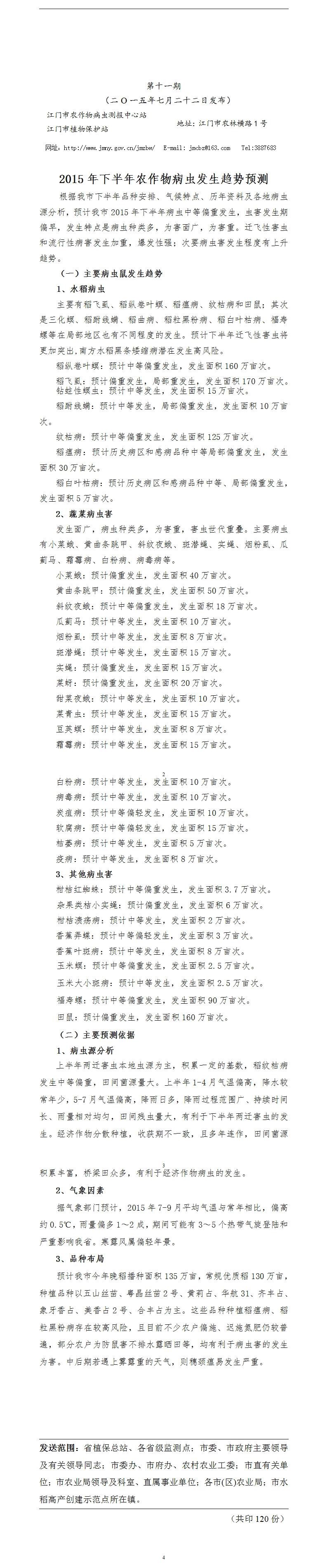 2015年农作物病虫情报第十一期(2015年下半年农作物病虫发生趋势预测)