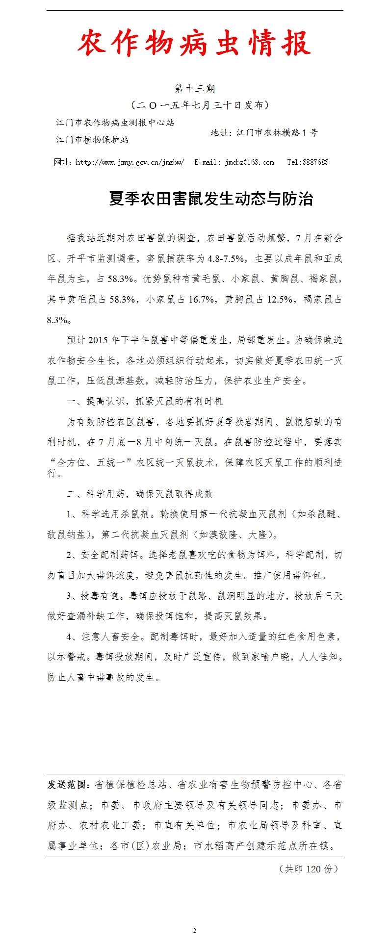 2015年农作物病虫情报第十三期(夏季农田害鼠发生动态与防治)