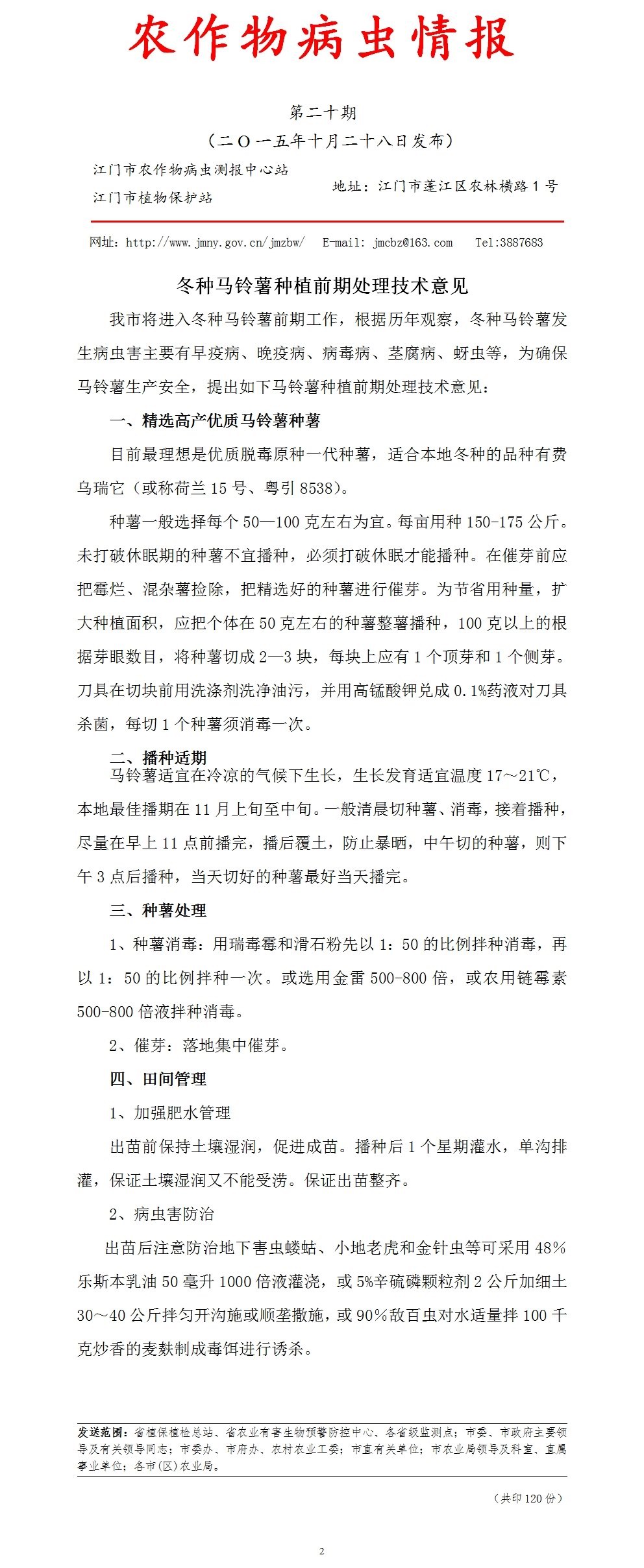 2015年农作物病虫情报第二十期(冬种马铃薯种植前期处理技术意见)
