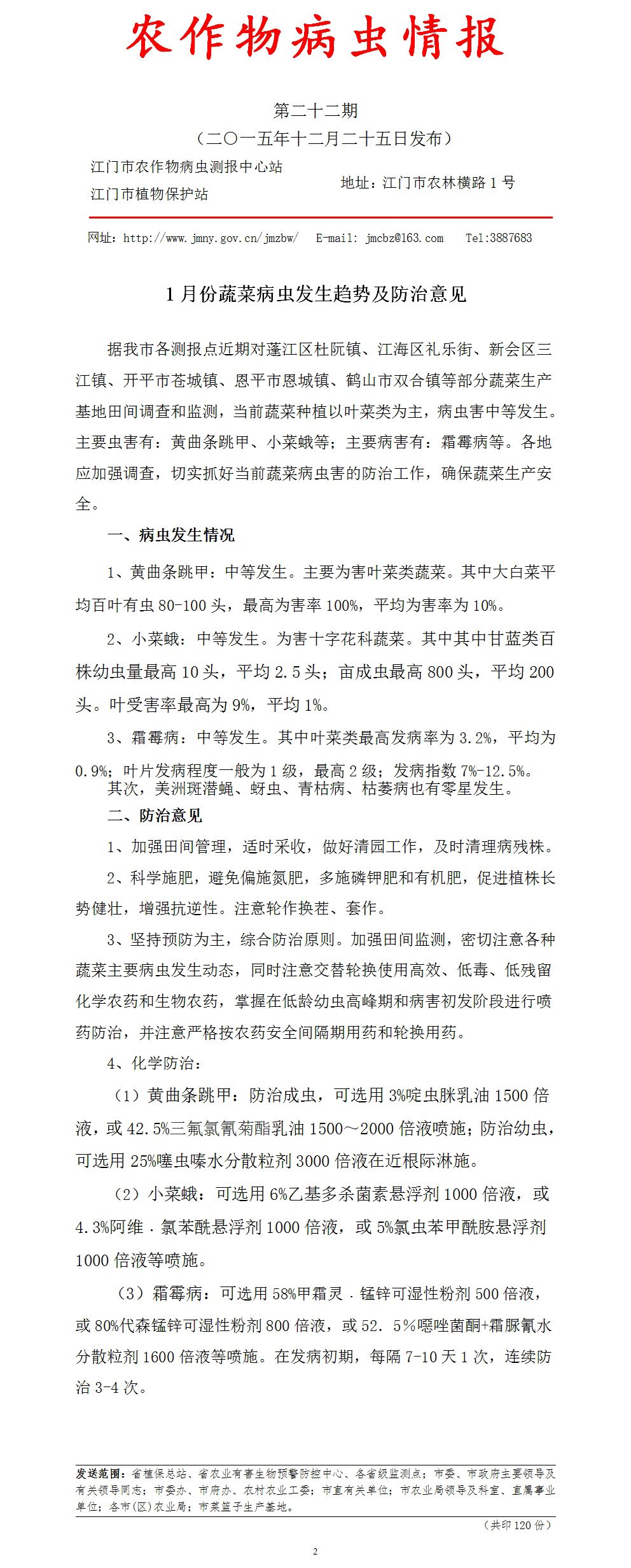 2015年农作物病虫情报第二十二期(1月份蔬菜病虫发生趋势及防治意见)