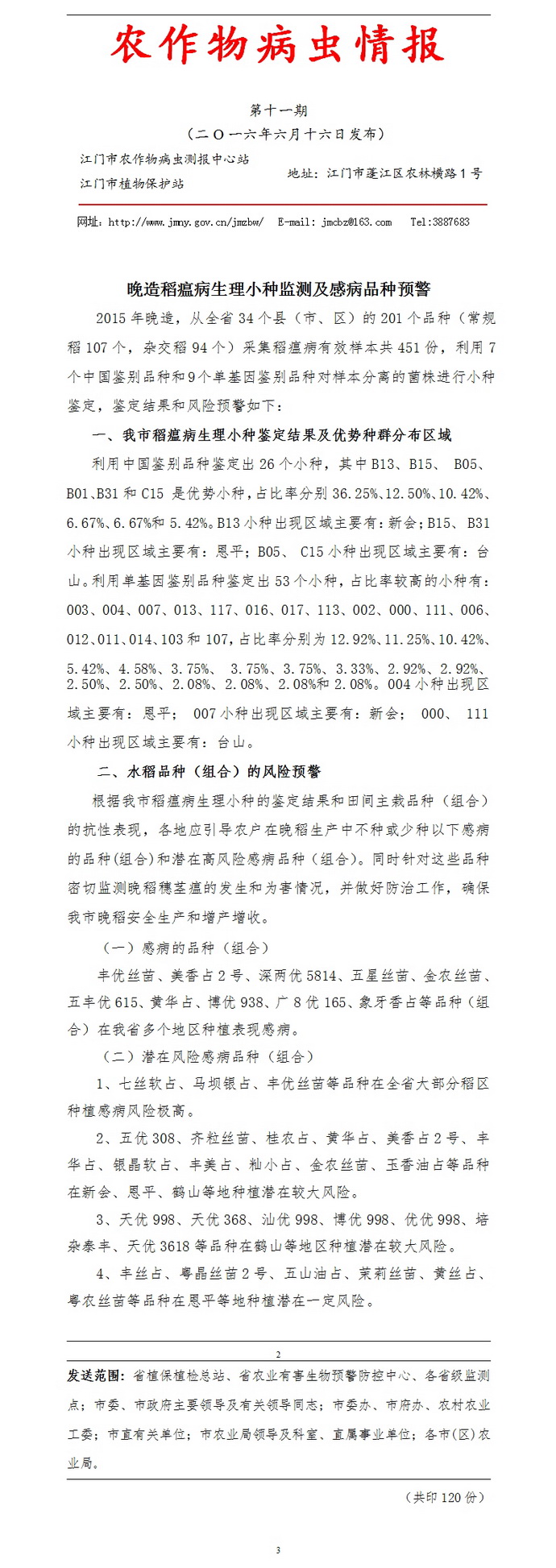 (晚造稻瘟病生理小种监测及感病品种预警)