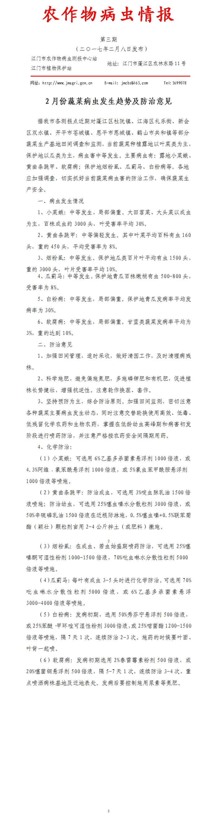 2017年农作物病虫情报 第三期(2月份蔬菜病虫发生趋势及防治意见)