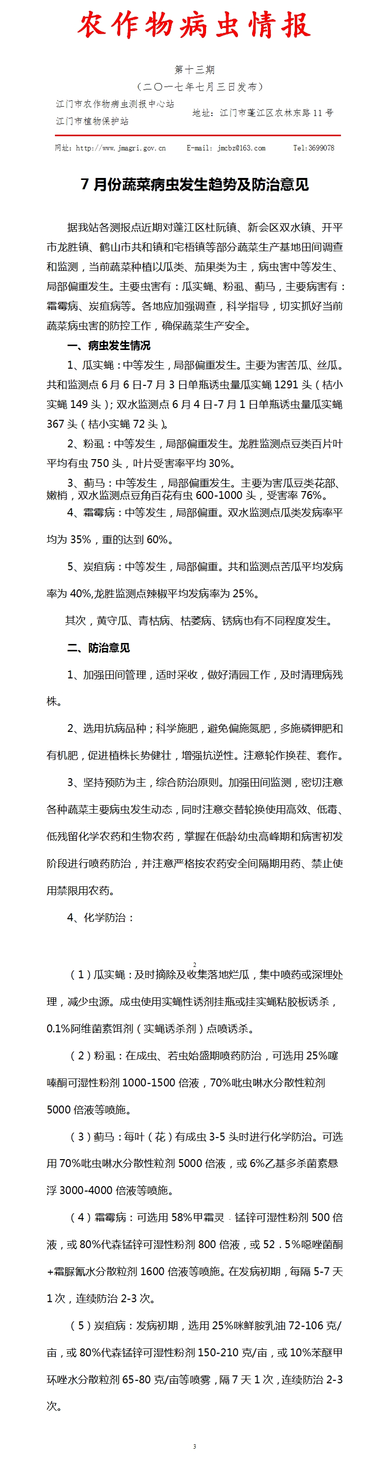 2017年江门市农作物病虫情报 第十三期(7月份蔬菜病虫发生趋势及防治意见)