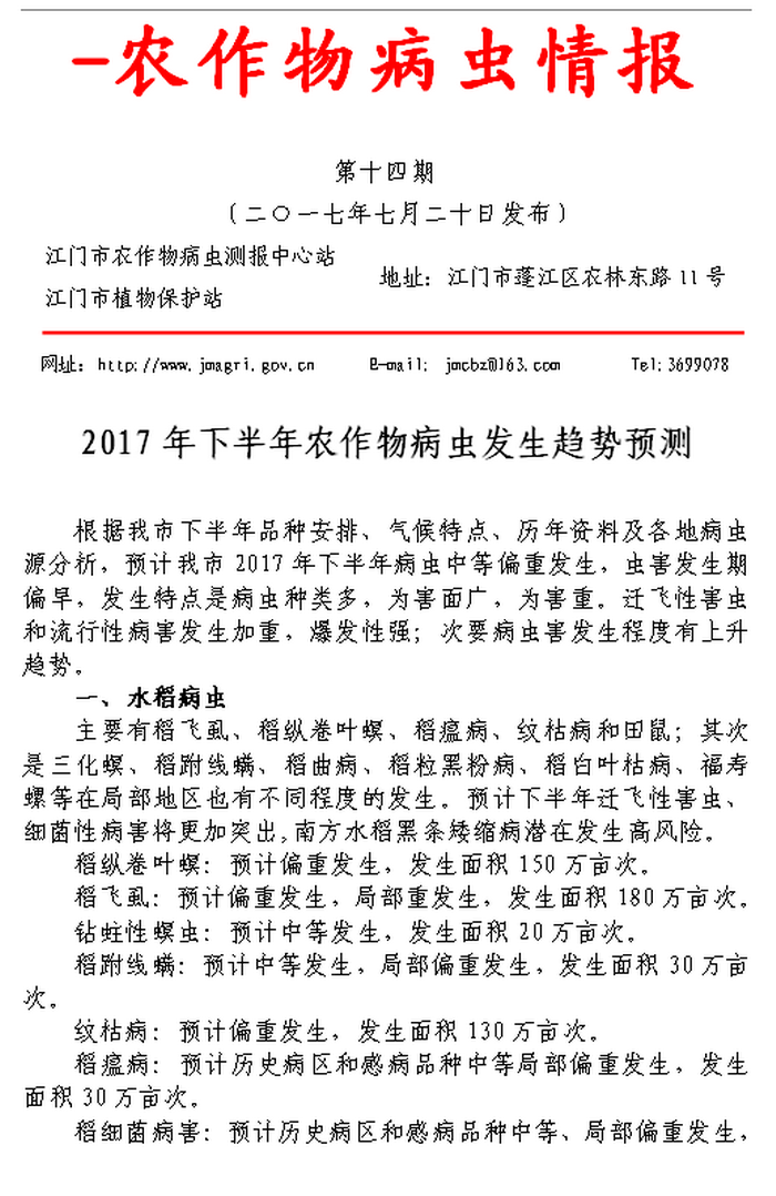 2017年江门市农作物病虫情报 第十四期(2017年下半年农作物病虫发生趋势预测)