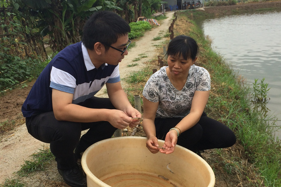 渔业部门专家为卢玉娴提供现场一对一养殖技术指导