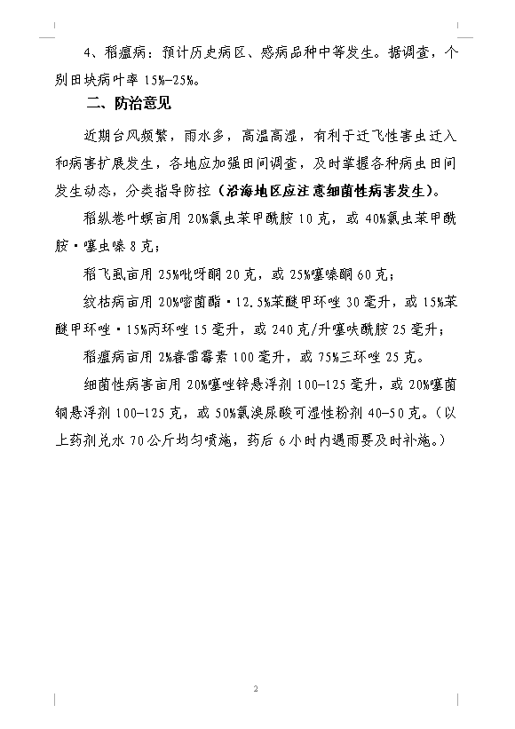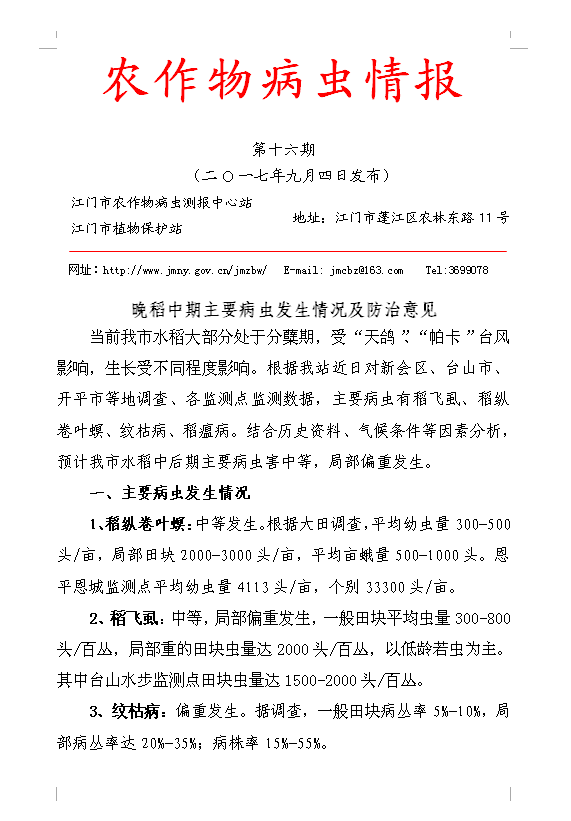 江门201716 农作物病虫情报(第16期)晚稻中期主要病虫发生情况及防治意见(红头)