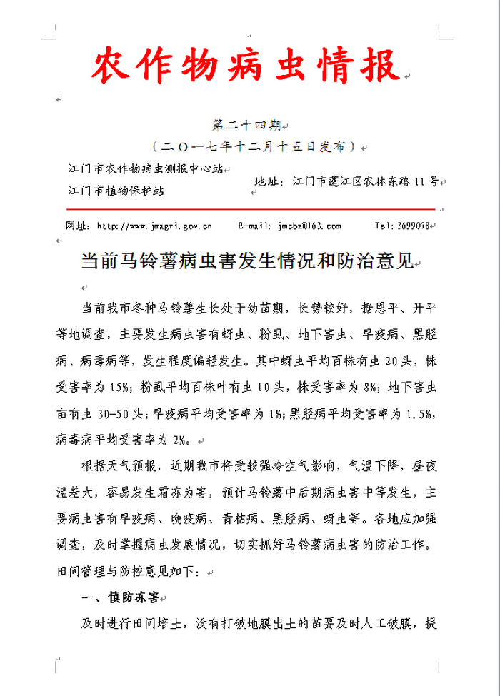 江门2017农作物病虫情报(第24期)当前马铃薯病虫害发生情况和防治意见