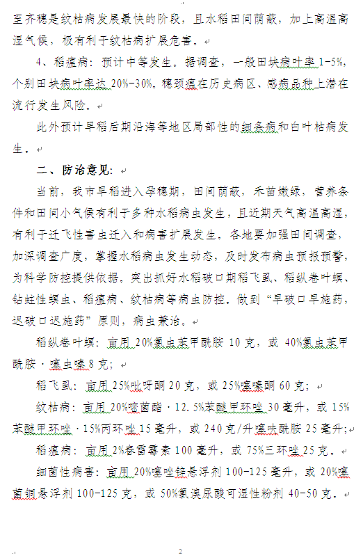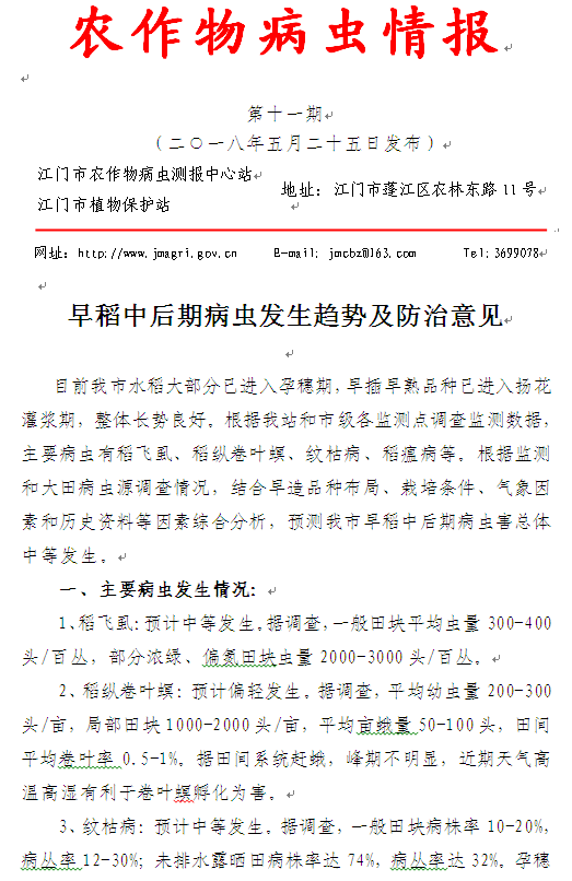 江门201811农作物病虫情报(第11期)早稻中后期主要病虫发生趋势及防治意见