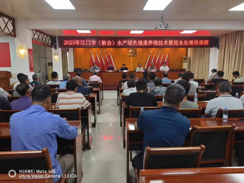 7月20日,江门市农业技术服务中心联合江门市新会区农业农村综合服务中心在古井镇举办一期水产绿色健康养殖技术暨尾水处理培训班,邀请了广东省农业科学院环境园艺所、江门市疫病预防控制中心等有关单位的领导和第三届中国兽医大会授课专家谢权忠、珠海新腾澳龙水产科技有限公司技术总监梁国飞等养殖专家到现场指导交流。古井镇水产养殖企业、专业合作社、养殖户等水产养殖从业人员约60人参加了此次培训。