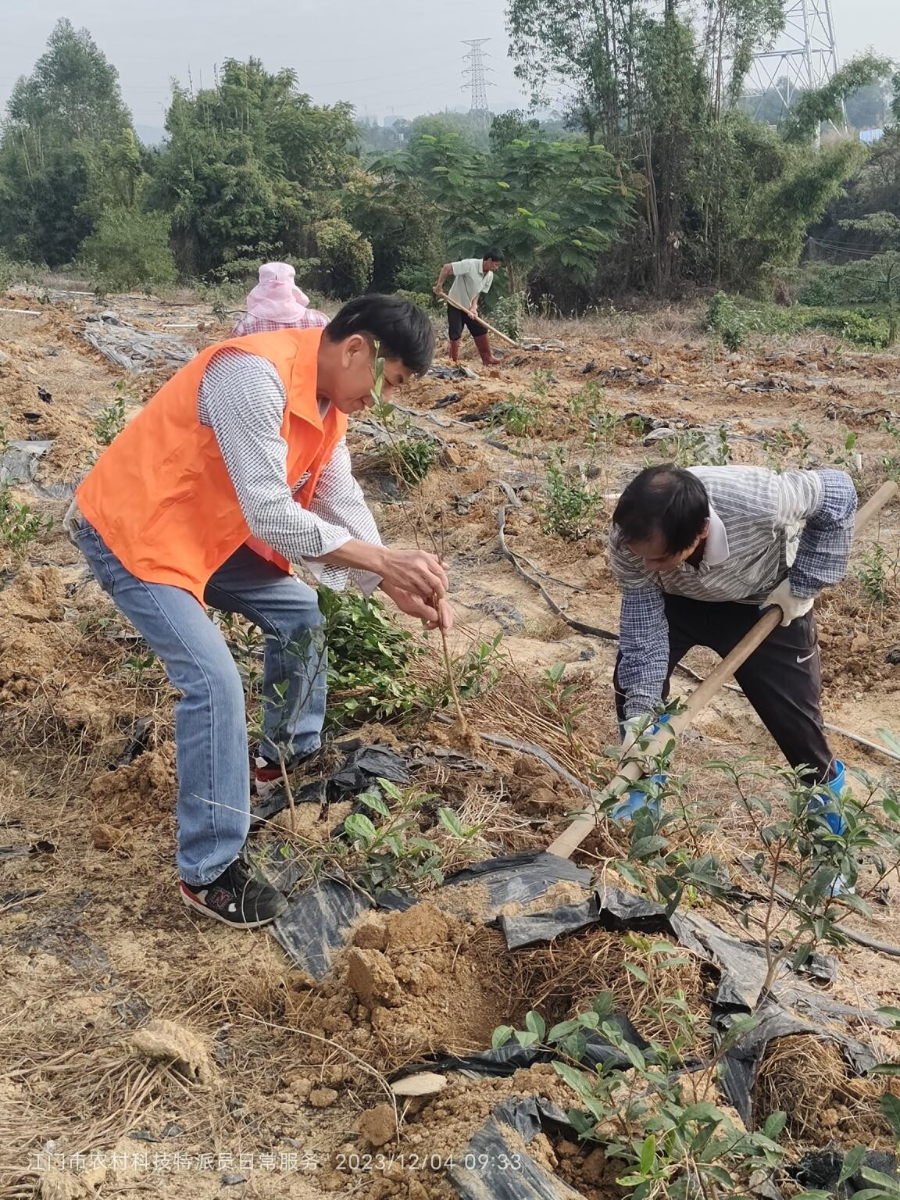 在鹤山市松霞茶园,该茶园主要种植茶叶160多亩,因过度施肥,病虫害高发等原因,茶园种植的茶苗大面积枯死,江门市农村科技特派员收到服务需求后,组织技术骨干到现场了解受损情况,向企业推荐补种福鼎大白等优良茶叶品种,在茶苗到位后,组织特派员到种植现场开展茶叶标准化生产技术培训,现场培训茶企茶农。
