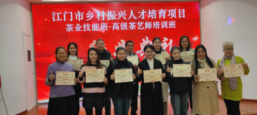 高级茶艺师课程围绕我市茶产业发展中的茶叶品茶评茶、茶艺、营销等茶产业发展所需技能技术开展,具体包括茶学的理论知识、茶叶的类别、名优茶鉴别、茶艺礼仪与表演、茶叶营销案例分享等,通过老师讲授与演示,学员实操体验等形式开展,讲授的内容均图文、影视多媒体并茂以及各类茶叶实物对比展示;高级评茶员课程围绕茶叶感官审评知识、茶叶标准、茶叶感官审评品质、绿茶红茶黑茶等六大茶类感官审评实操开展授课,让学员在短短5天的培训即能系统地掌握相关知识技能,达到最优的培训成效。学员均表示本次国家级师资的授课,理论知识与实操经验均相当专业、丰富,通过学习收获了知识、收获了平台资源,自身的知识和技能得到显著提升,开阔了眼界和思路,今后更有信心为江门市乡村振兴发展贡献力量,希望这类专业的培训能继续多开展。培训完成后,承办机构为学员颁发了培训证书。